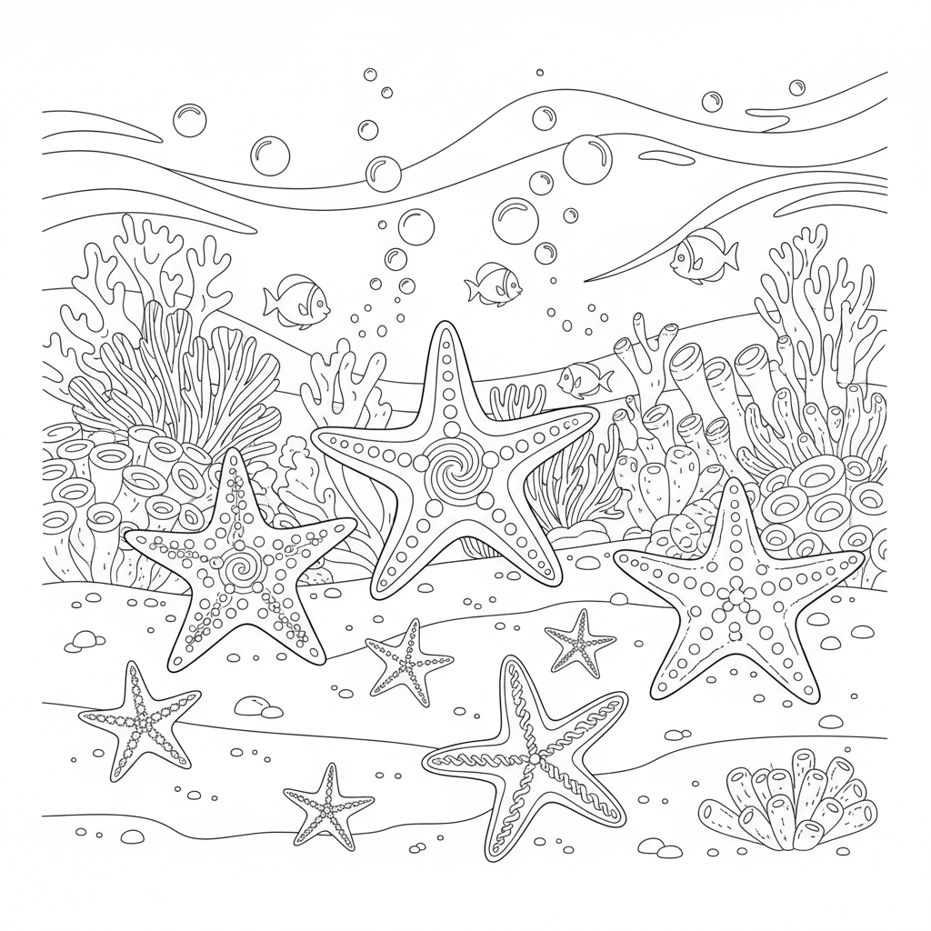 Beautiful star fish underwater scene coloring page for kids and adults. Free to download and print.