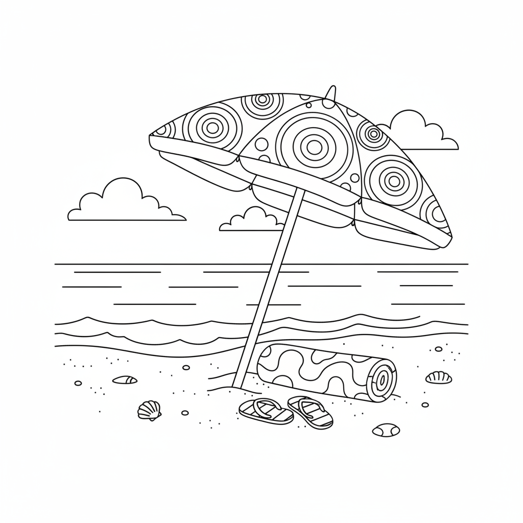 Beautiful beach umbrella and towel scene coloring page for kids and adults. Free to download and print.