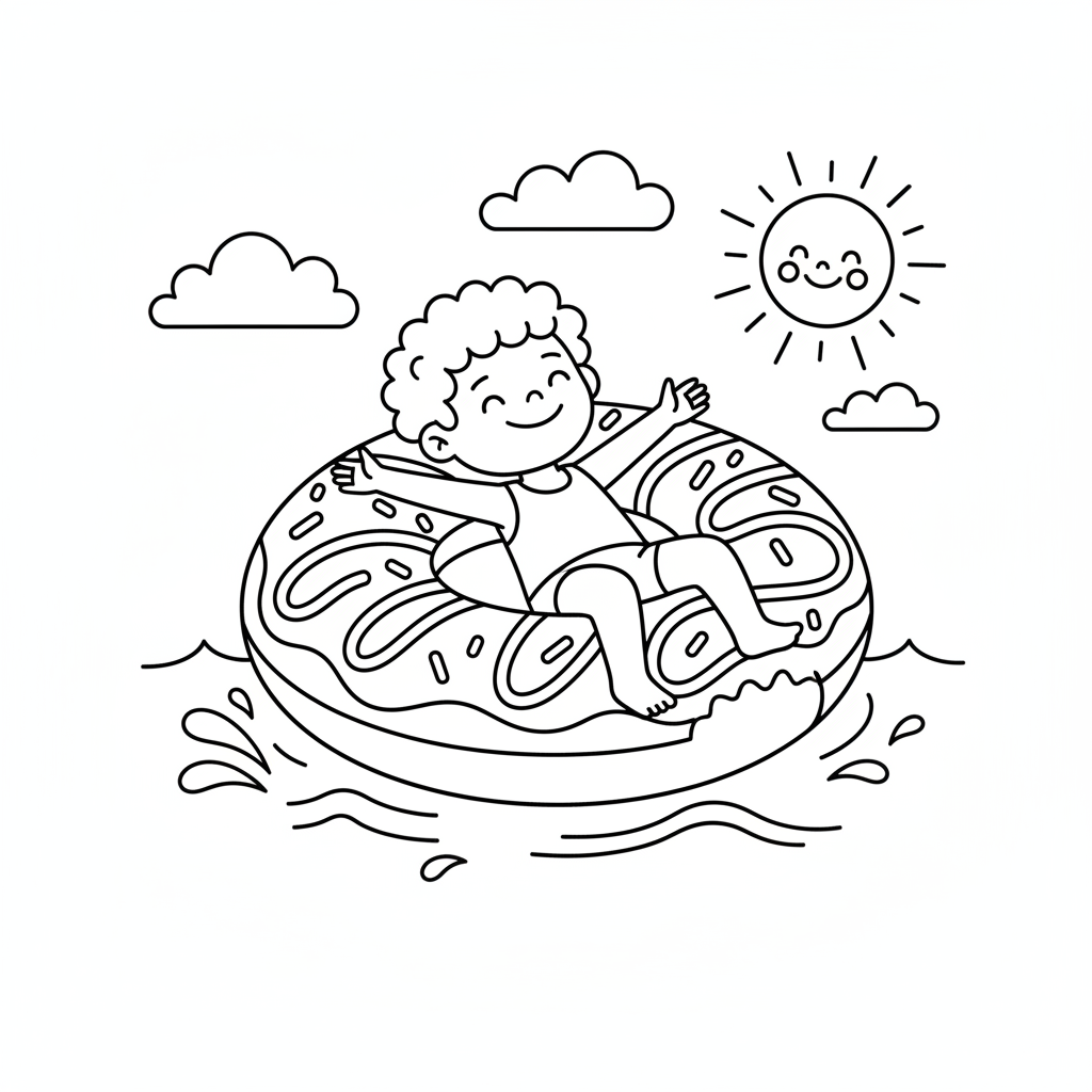 A delightful summer coloring page featuring floating on inflatable donut relaxing. Perfect for kids and adults who love coloring!