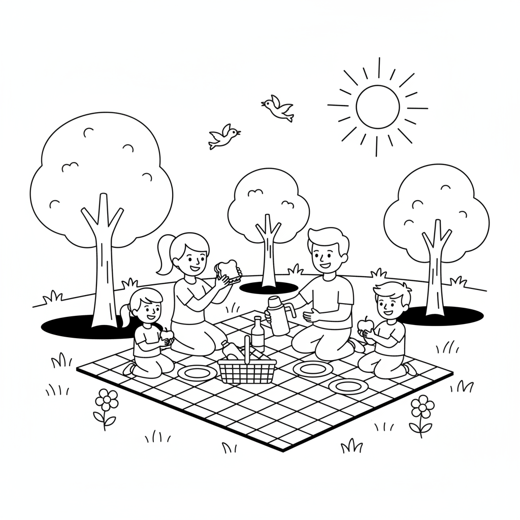 A delightful summer coloring page featuring picnic blanket in sunny park family. Perfect for kids and adults who love coloring!