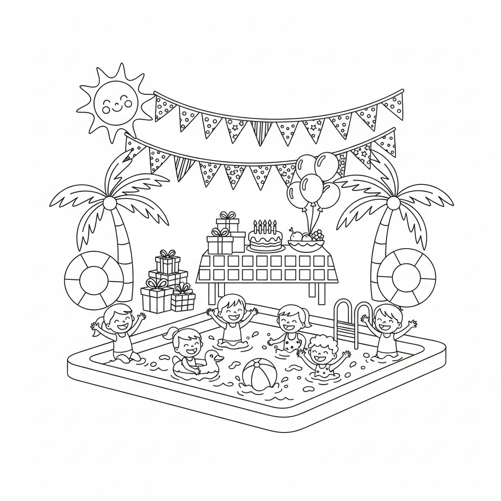 A delightful summer coloring page featuring pool party with decorations celebration. Perfect for kids and adults who love coloring!