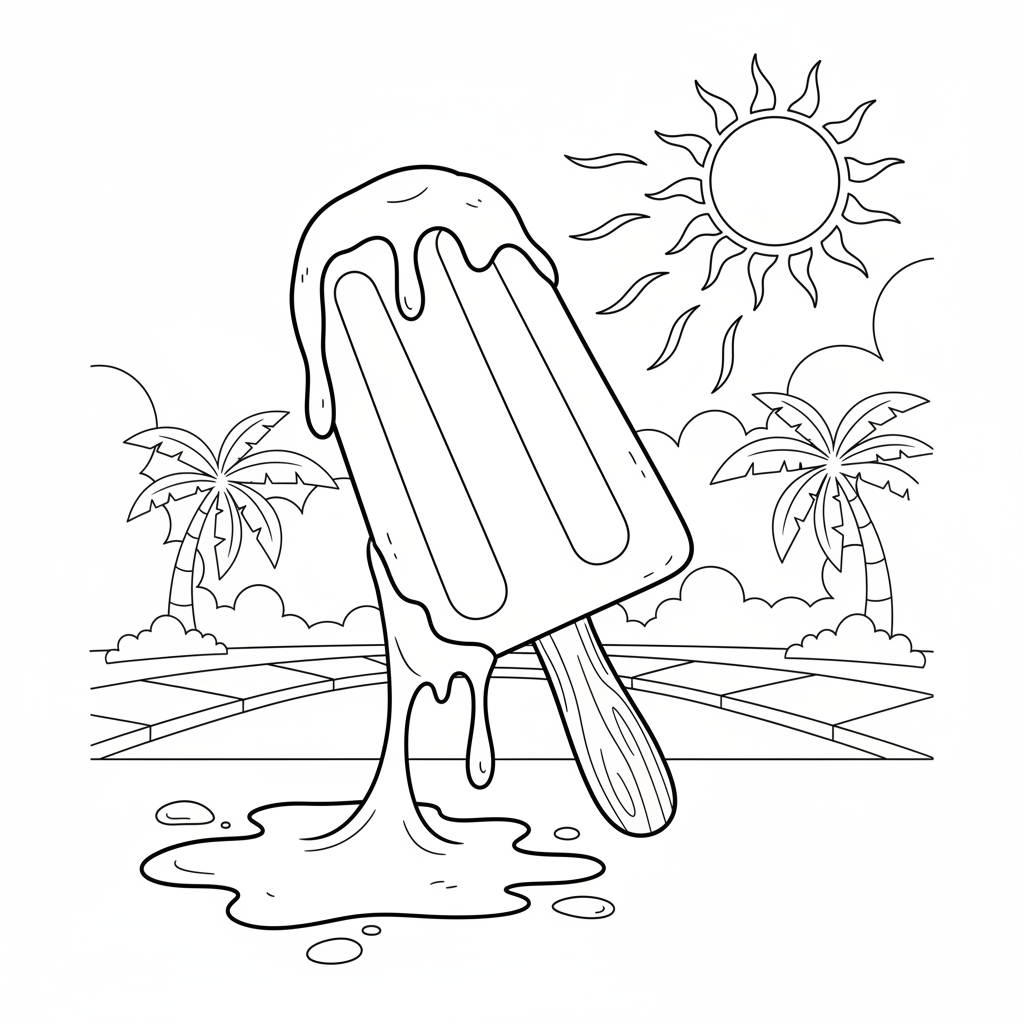 Beautiful popsicle melting in summer heat coloring page for kids and adults. Free to download and print.