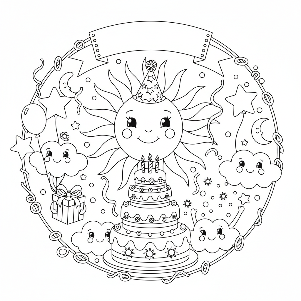 Beautiful sun birthday celebration coloring page for kids and adults. Free to download and print.