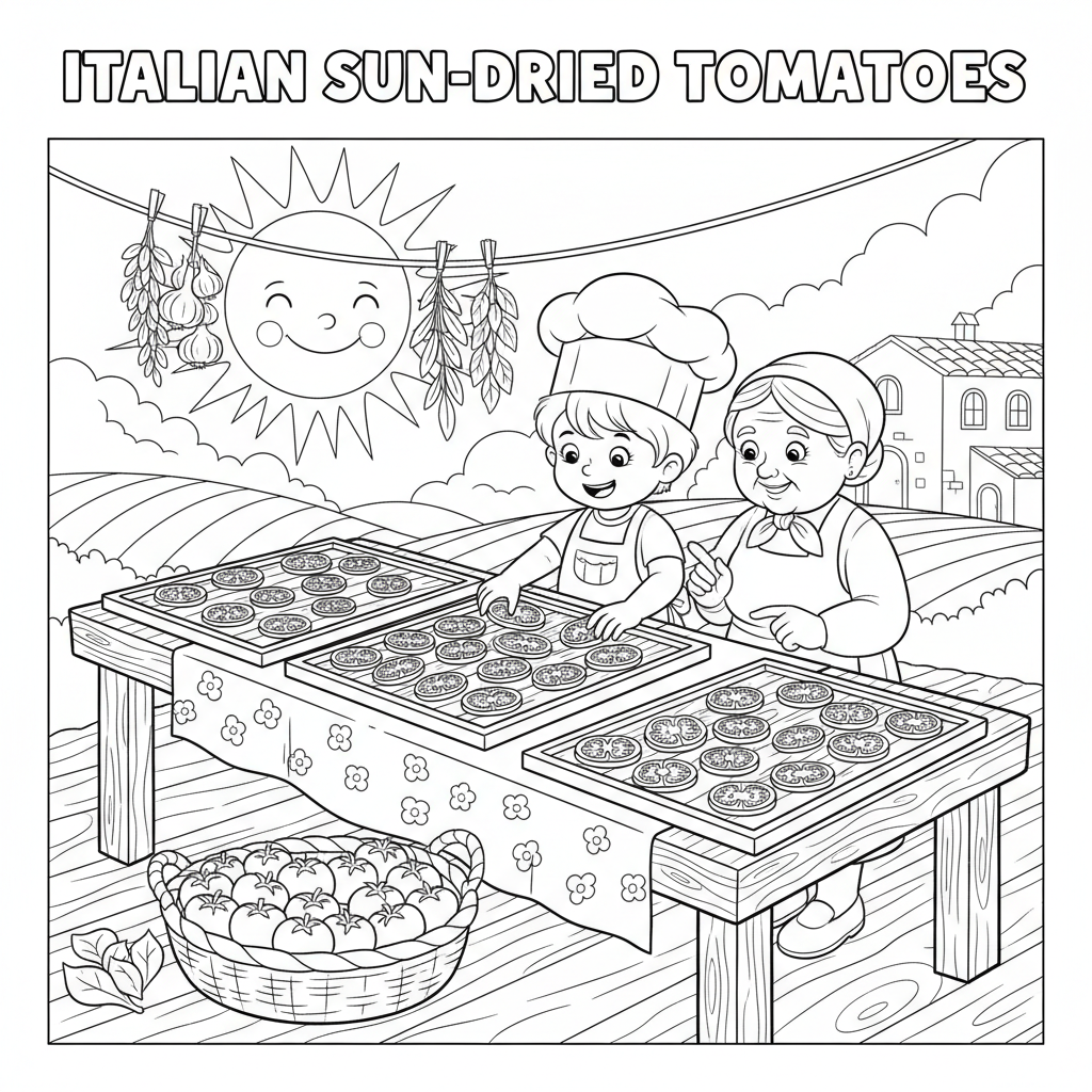A delightful sun coloring page featuring sun dried tomatoes food preparation Italian cuisine. Perfect for kids and adults who love coloring!