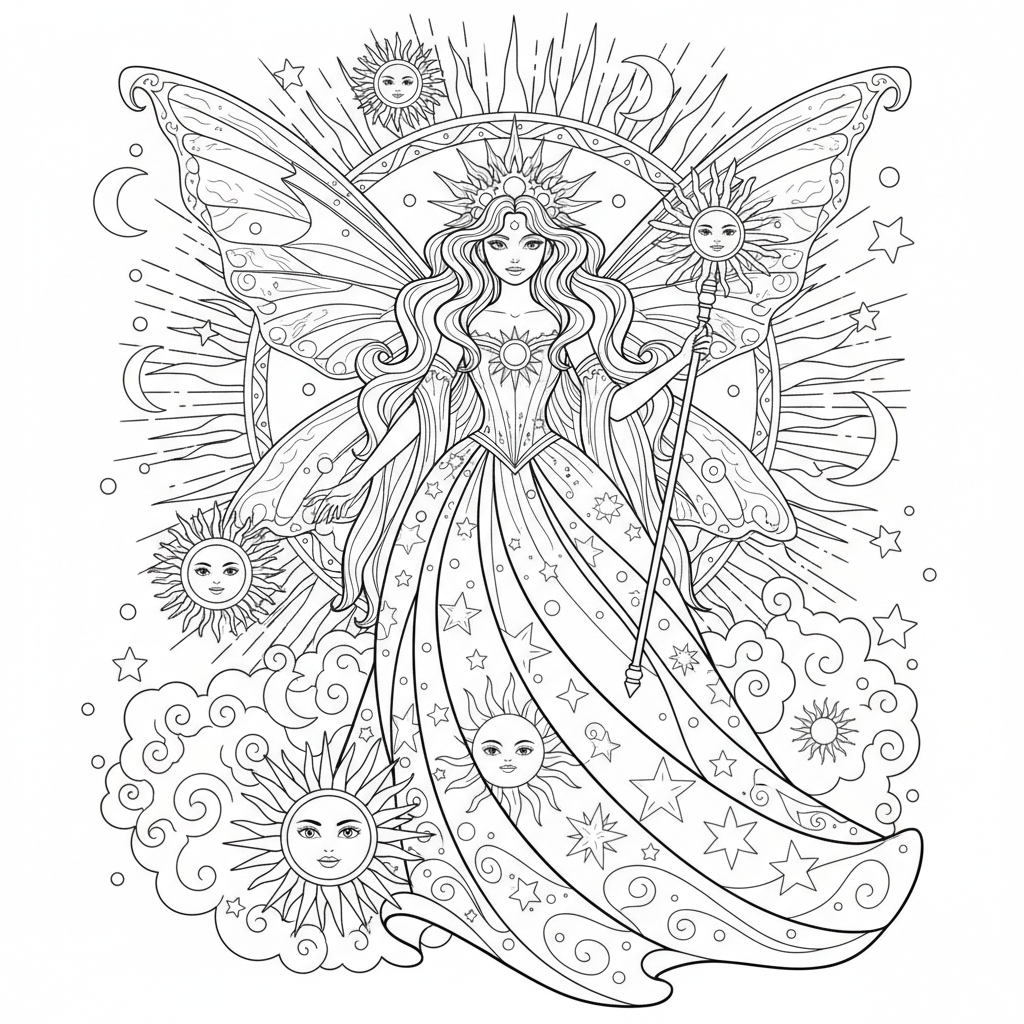 Beautiful sun fairy princess coloring page for kids and adults. Free to download and print.
