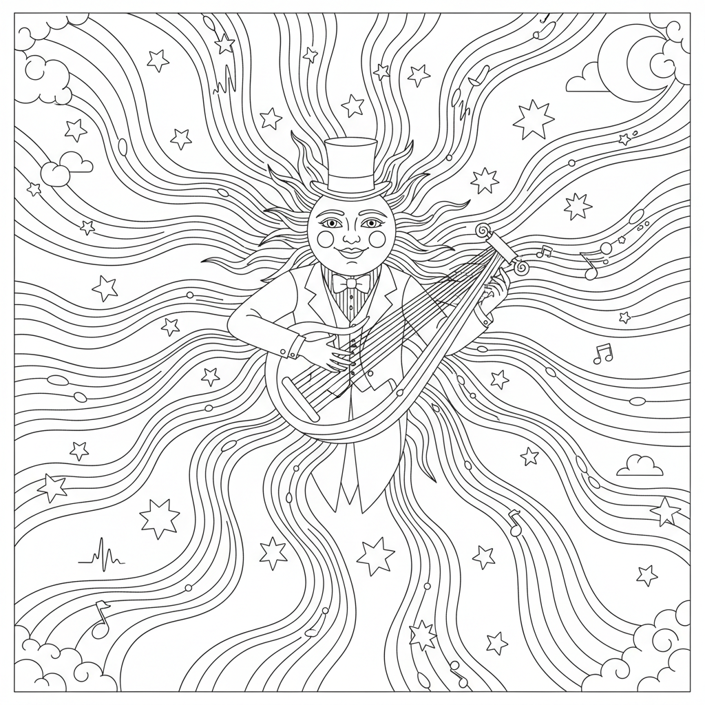 Beautiful sun musician playing rays coloring page for kids and adults. Free to download and print.