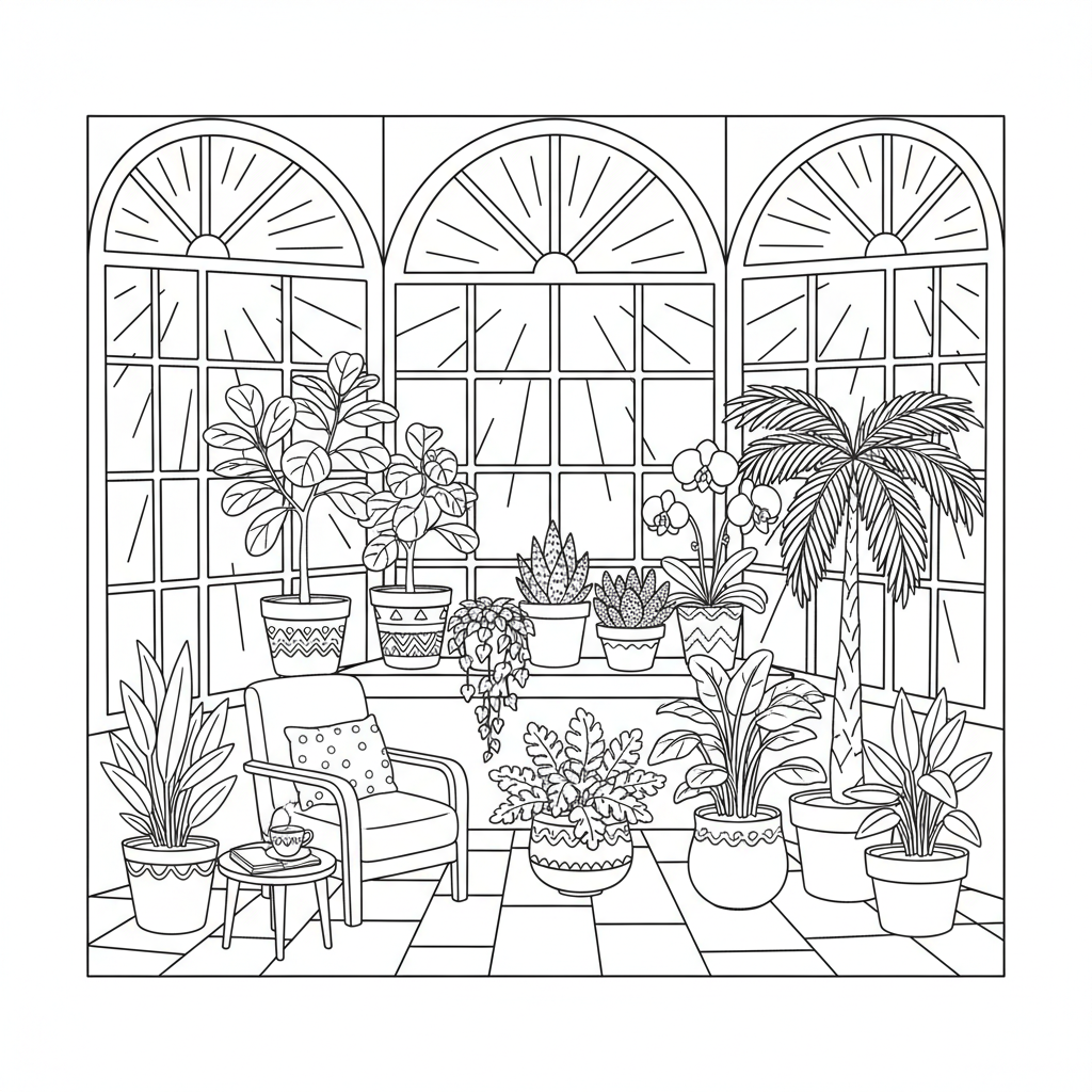 A delightful sun coloring page featuring sun room bright windows indoor garden plants. Perfect for kids and adults who love coloring!