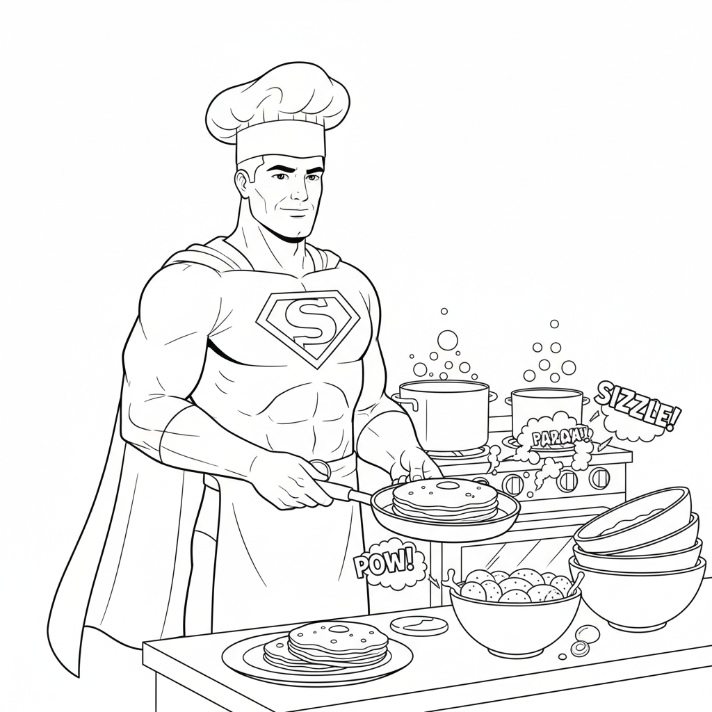 Beautiful superhero cooking dinner coloring page for kids and adults. Free to download and print.