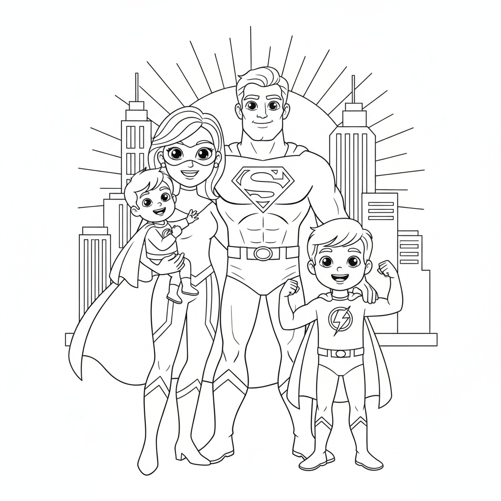 Beautiful superhero family portrait coloring page for kids and adults. Free to download and print.