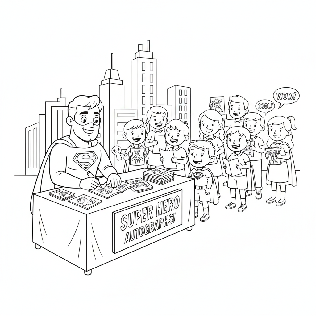 A delightful superhero coloring page featuring superhero fan meeting autograph signing event celebrity. Perfect for kids and adults who love coloring!