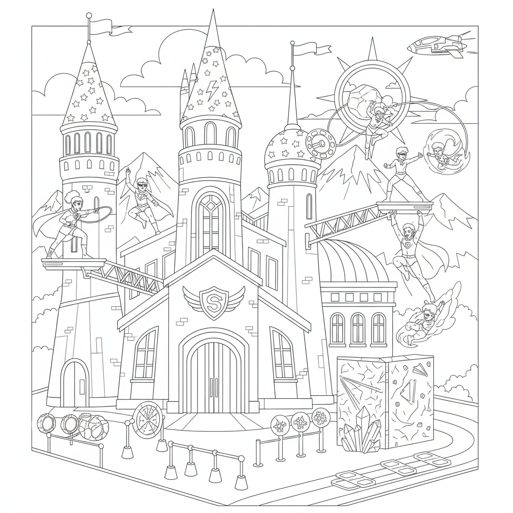 Beautiful superhero school academy coloring page for kids and adults. Free to download and print.