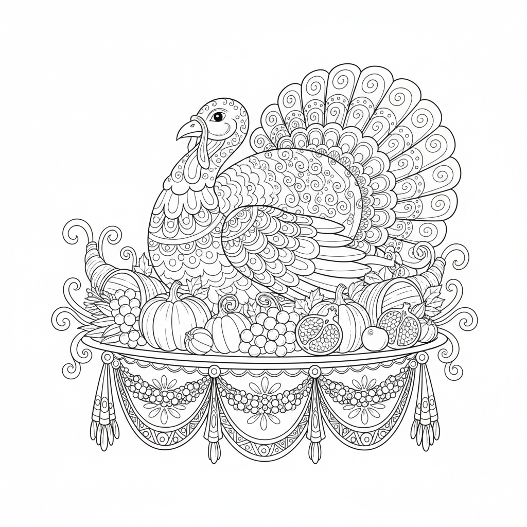 Beautiful fancy decorated turkey centerpiece coloring page for kids and adults. Free to download and print.