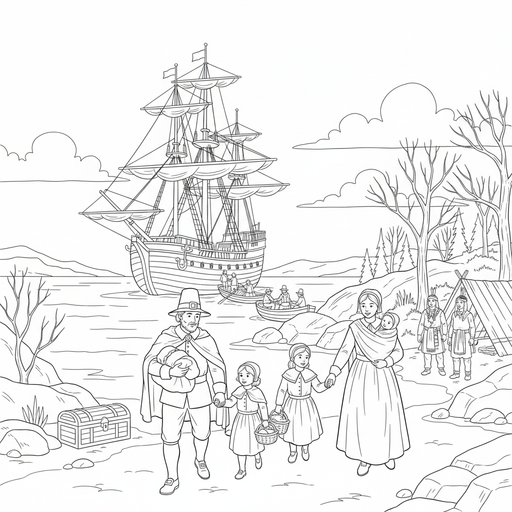 Beautiful pilgrim family arriving on Mayflower coloring page for kids and adults. Free to download and print.