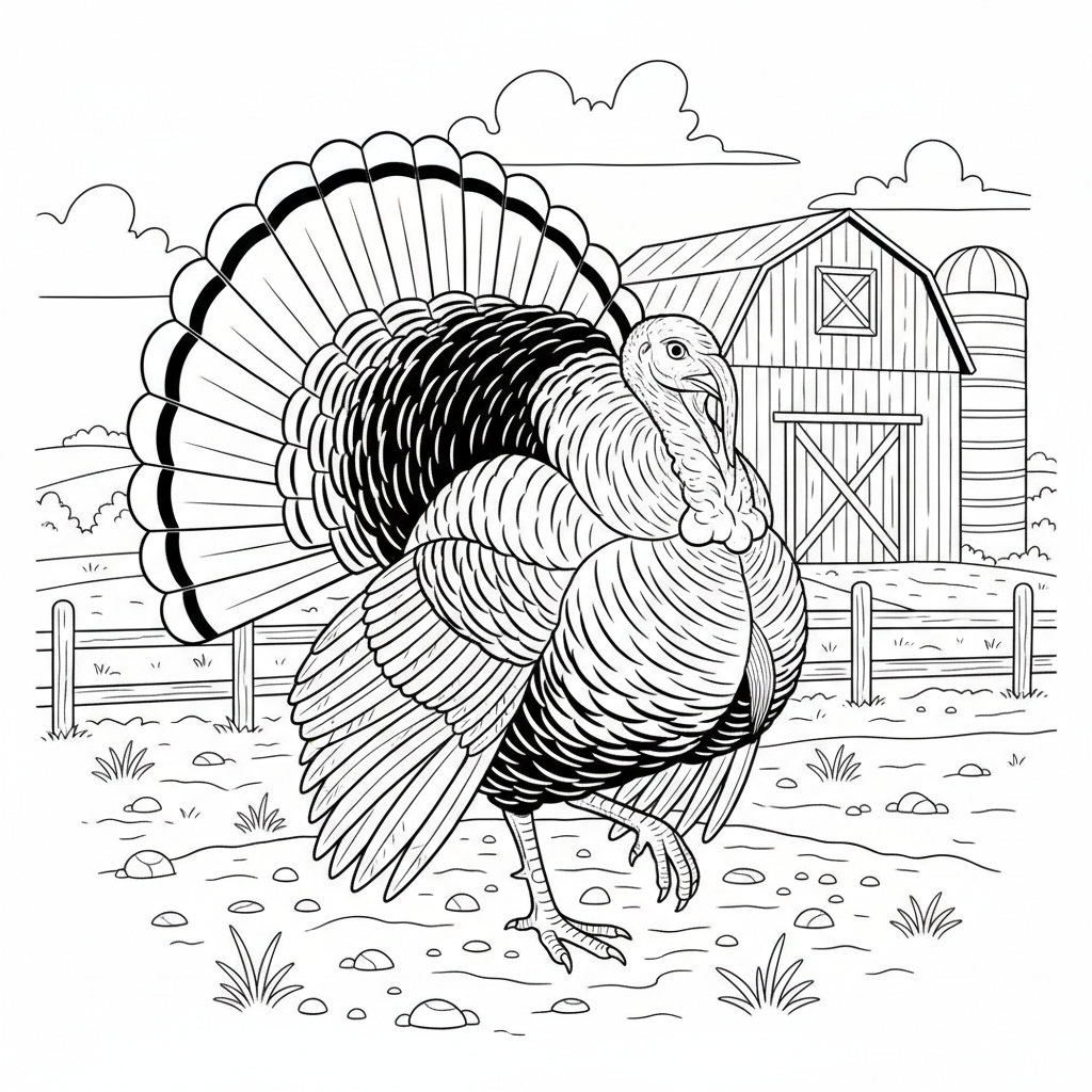 Beautiful realistic turkey strutting on farm coloring page for kids and adults. Free to download and print.