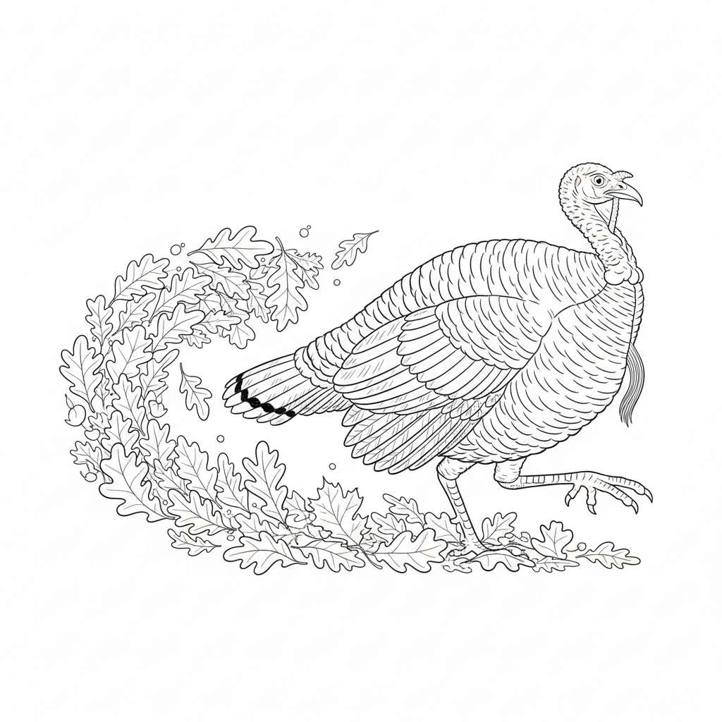 Beautiful turkey running through autumn leaves coloring page for kids and adults. Free to download and print.