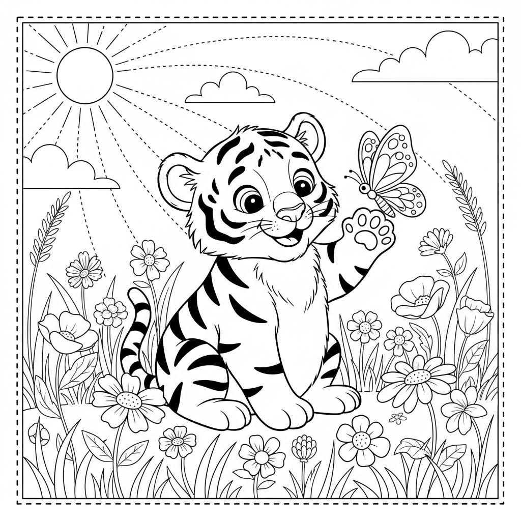 A delightful tiger coloring page featuring adorable tiger cub playing with a butterfly in a sunny meadow with wildflowers. Perfect for kids and adults who love coloring!