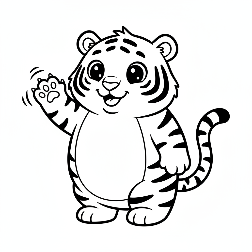 A delightful tiger coloring page featuring cute cartoon tiger with big round eyes and oversized paws waving hello. Perfect for kids and adults who love coloring!