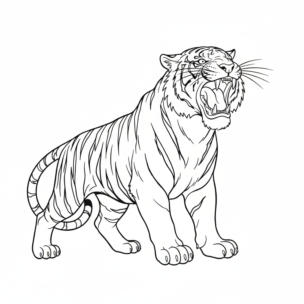 A delightful tiger coloring page featuring fierce tiger roaring with mouth wide open showing sharp teeth and whiskers. Perfect for kids and adults who love coloring!