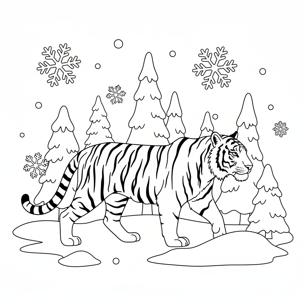 A delightful tiger coloring page featuring Siberian tiger walking through snowy forest with snowflakes falling around. Perfect for kids and adults who love coloring!