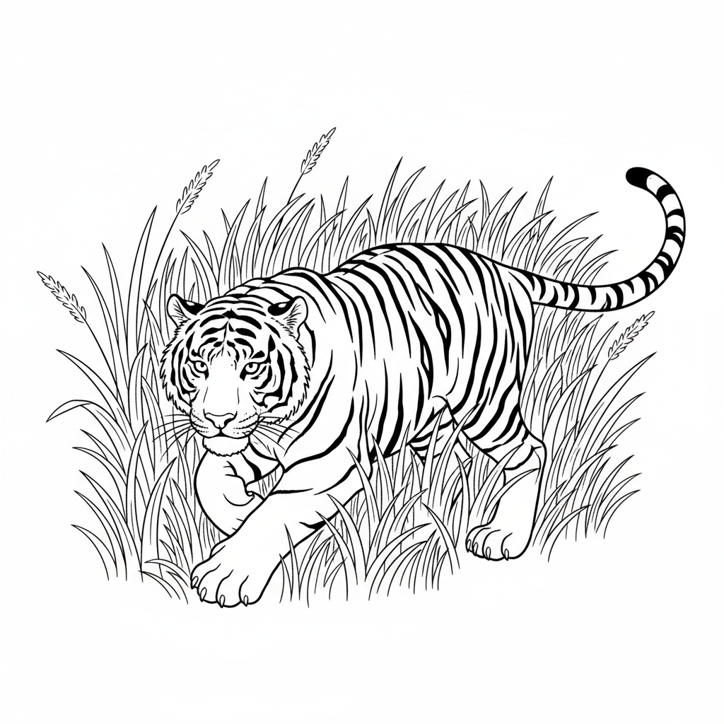 A delightful tiger coloring page featuring Sumatran tiger crouching low in tall elephant grass ready to pounce. Perfect for kids and adults who love coloring!