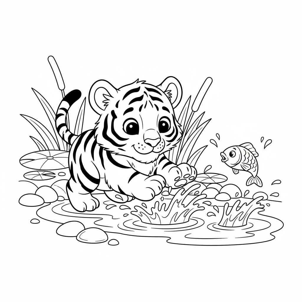 A delightful tiger coloring page featuring tiger cub trying to catch a fish in a shallow stream with paws splashing. Perfect for kids and adults who love coloring!
