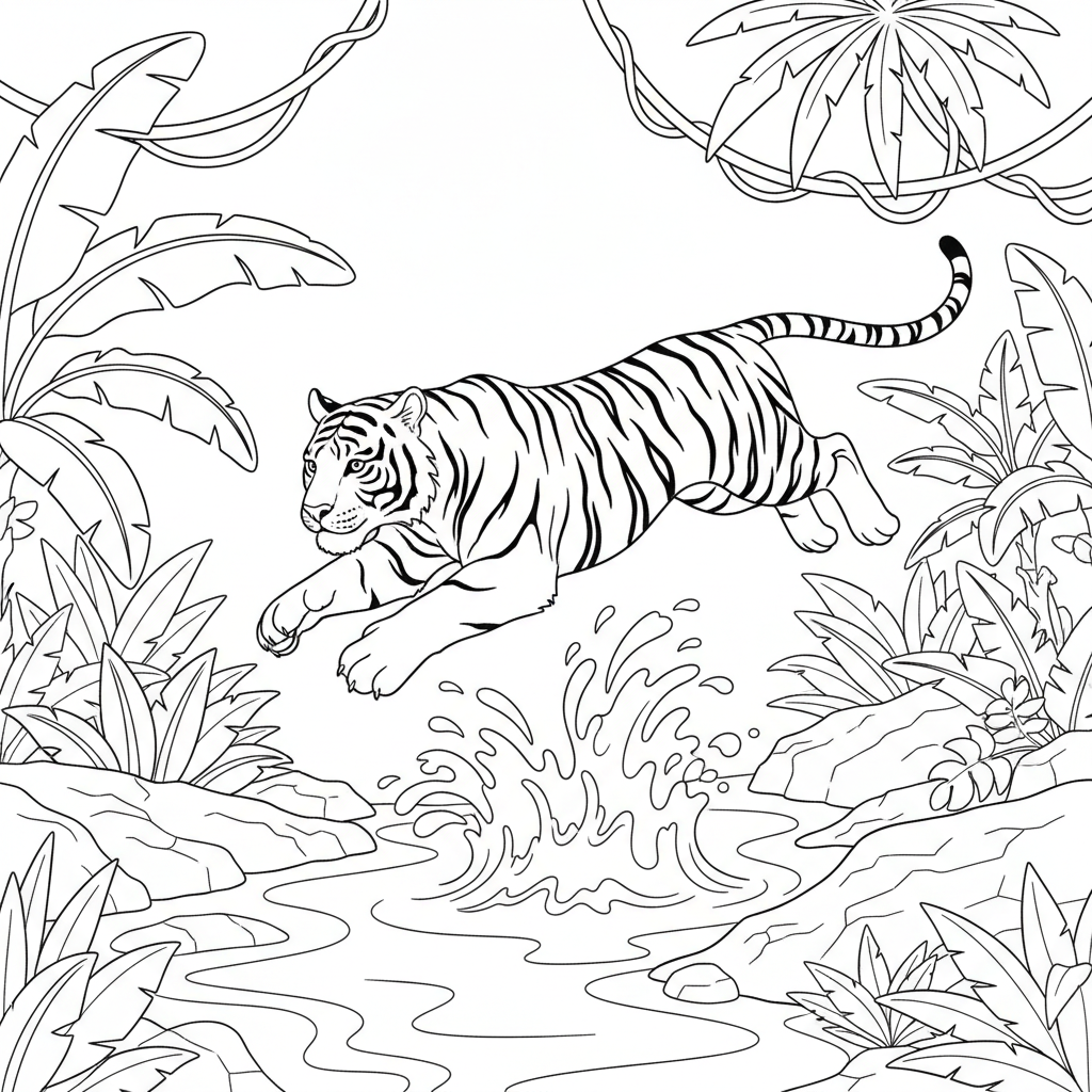A delightful tiger coloring page featuring tiger leaping gracefully across a jungle stream with water splashing below. Perfect for kids and adults who love coloring!