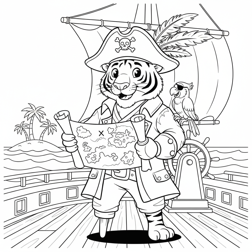 A delightful tiger coloring page featuring tiger pirate captain standing on ship deck with treasure map and parrot. Perfect for kids and adults who love coloring!