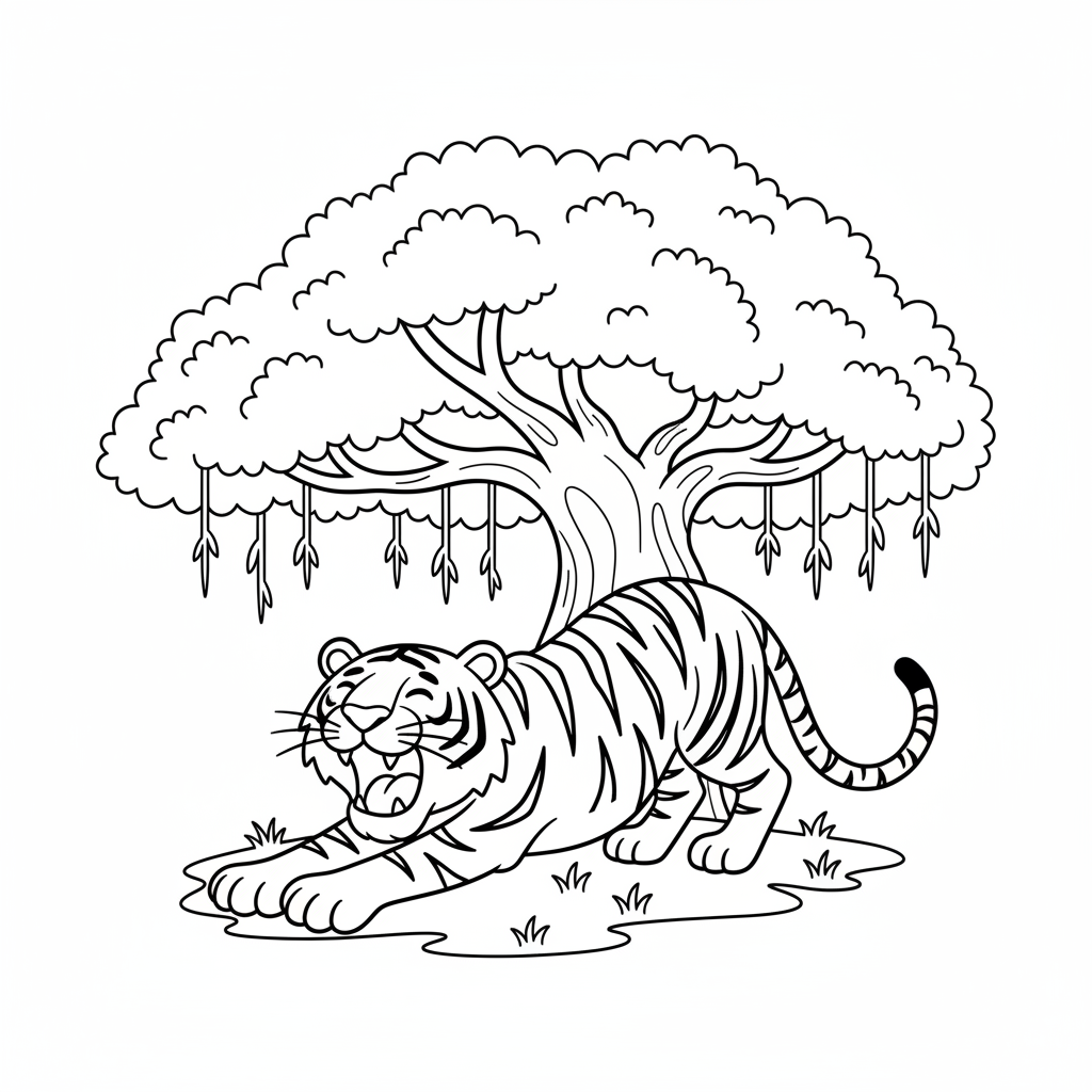 A delightful tiger coloring page featuring tiger stretching and yawning lazily under a shady banyan tree. Perfect for kids and adults who love coloring!
