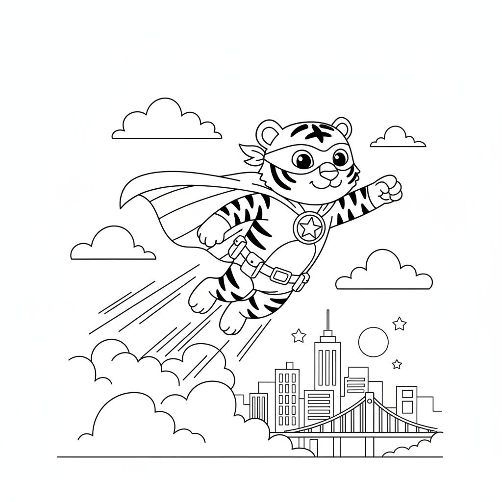 A delightful tiger coloring page featuring tiger superhero wearing a cape and mask flying through clouds over city. Perfect for kids and adults who love coloring!