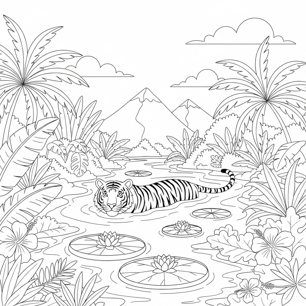A delightful tiger coloring page featuring tiger swimming in tropical river with lily pads and lush vegetation around. Perfect for kids and adults who love coloring!