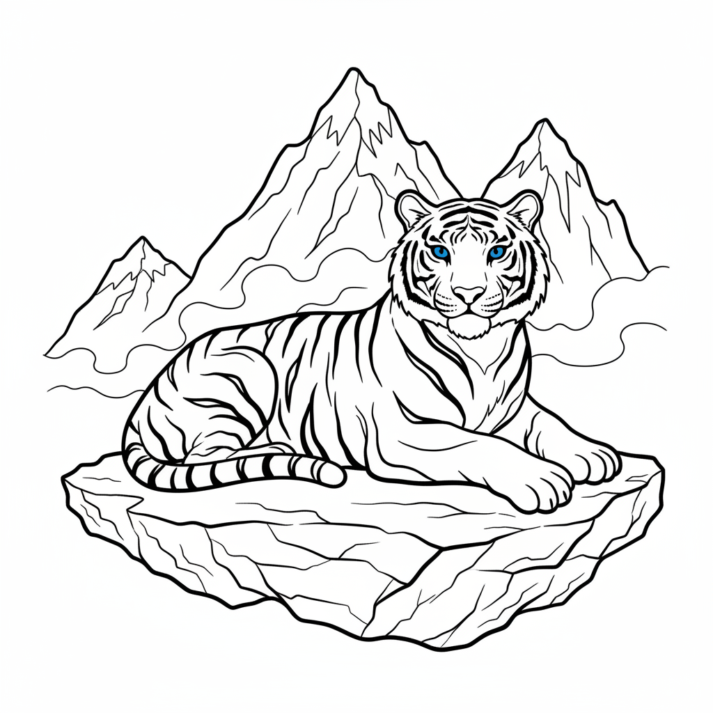 A delightful tiger coloring page featuring white tiger with striking blue eyes resting on a rocky ledge in misty mountains. Perfect for kids and adults who love coloring!