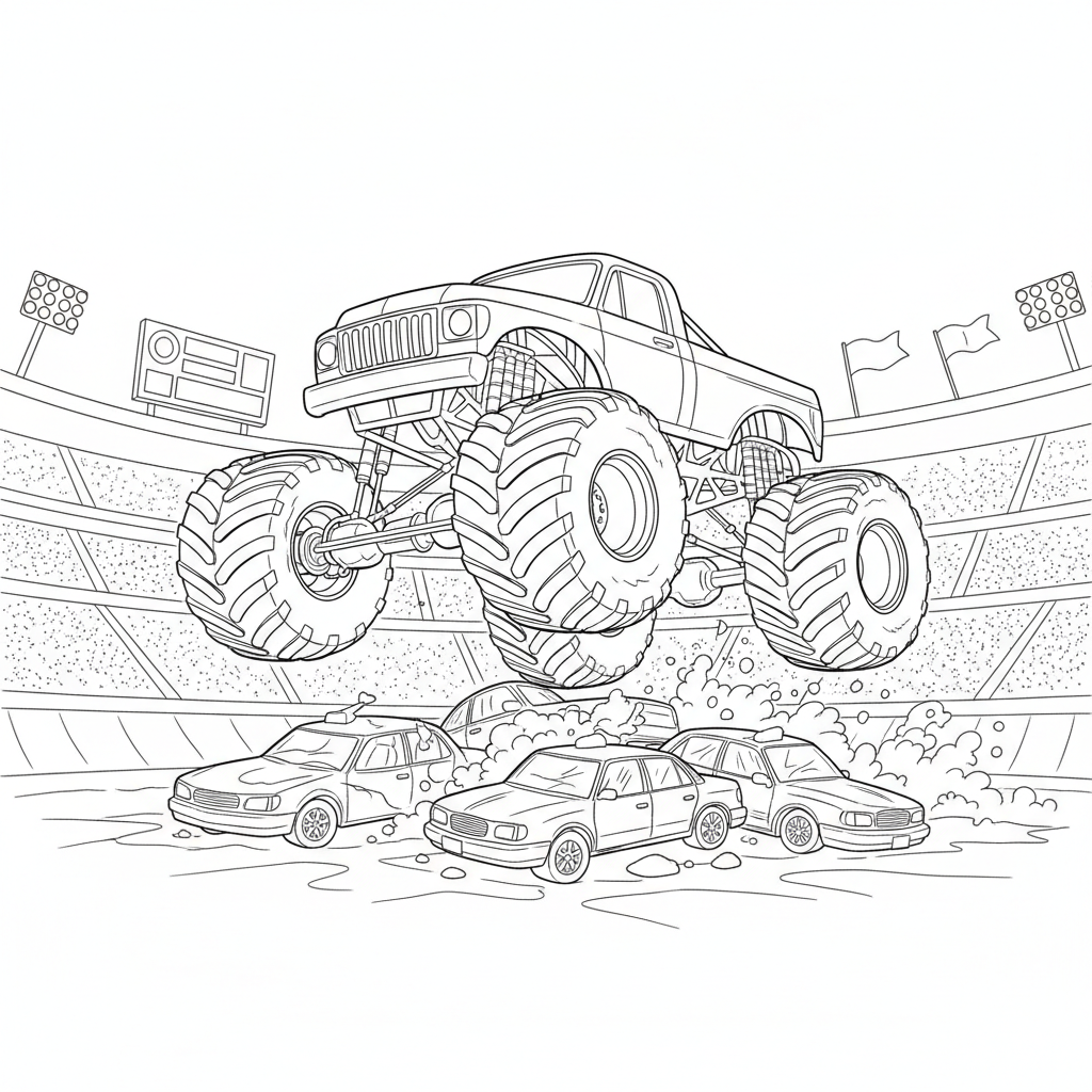 Beautiful monster truck jumping coloring page for kids and adults. Free to download and print.