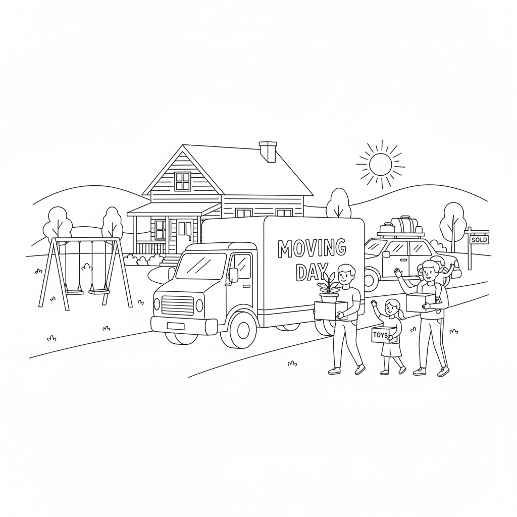 Beautiful moving truck family relocation coloring page for kids and adults. Free to download and print.