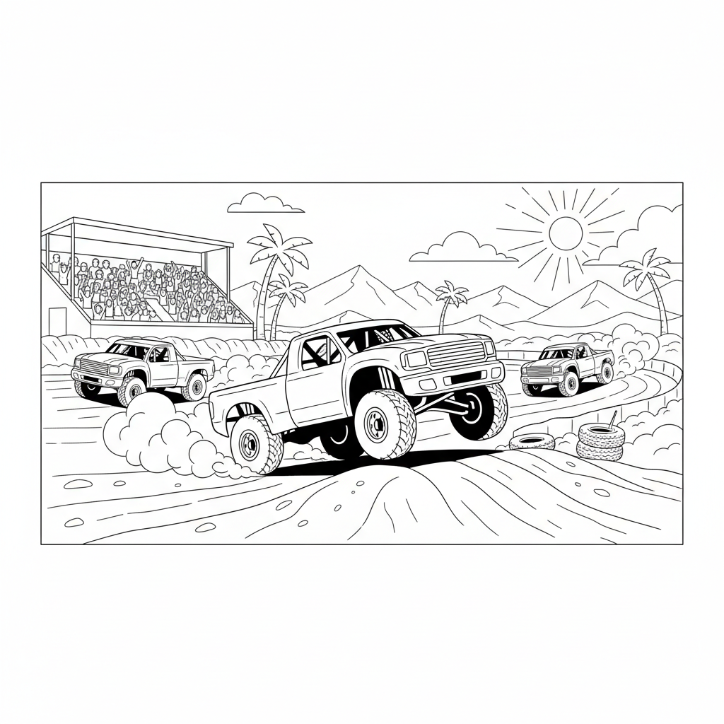 Beautiful race truck competition coloring page for kids and adults. Free to download and print.