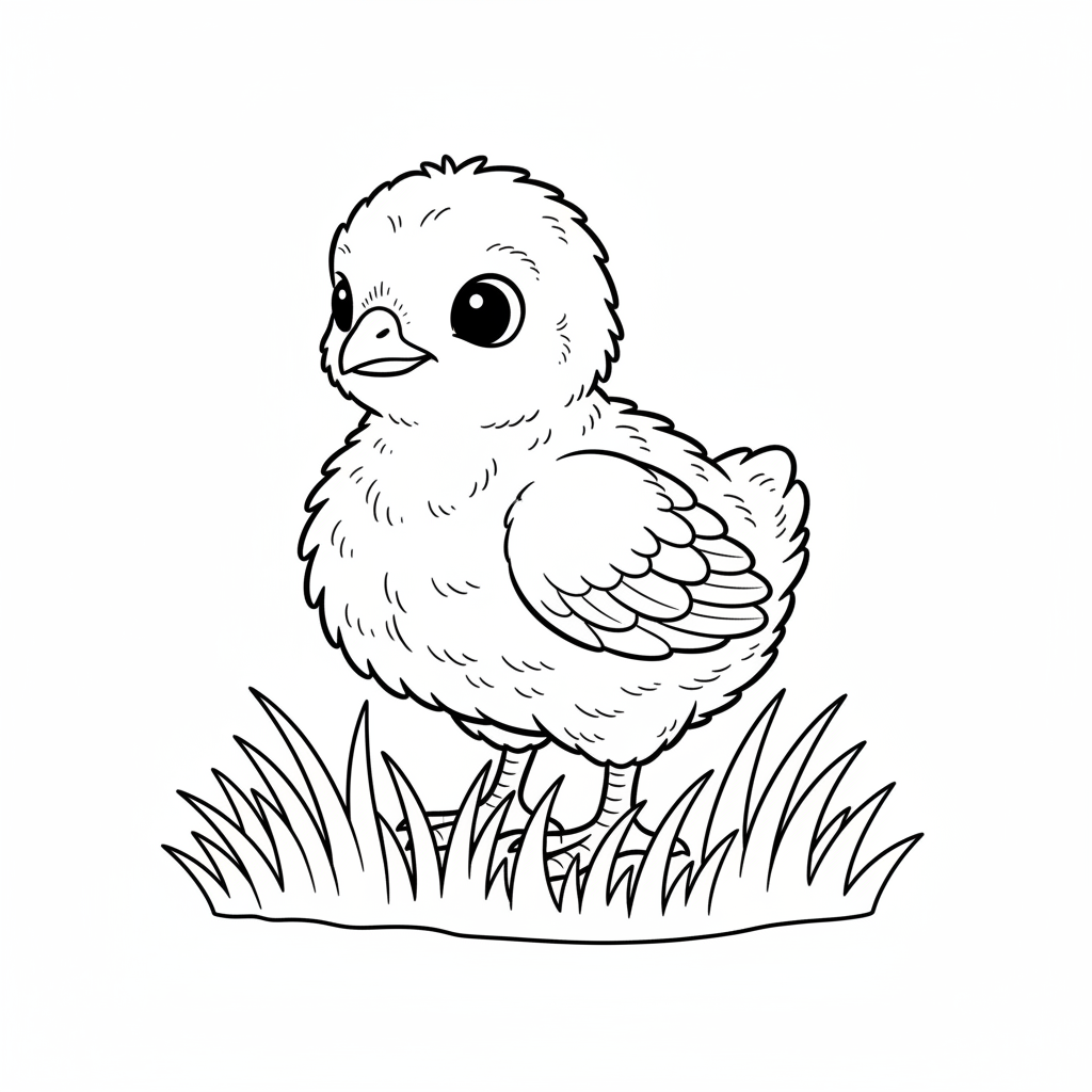 A delightful turkey coloring page featuring baby turkey poult standing in grass with fluffy down feathers. Perfect for kids and adults who love coloring!