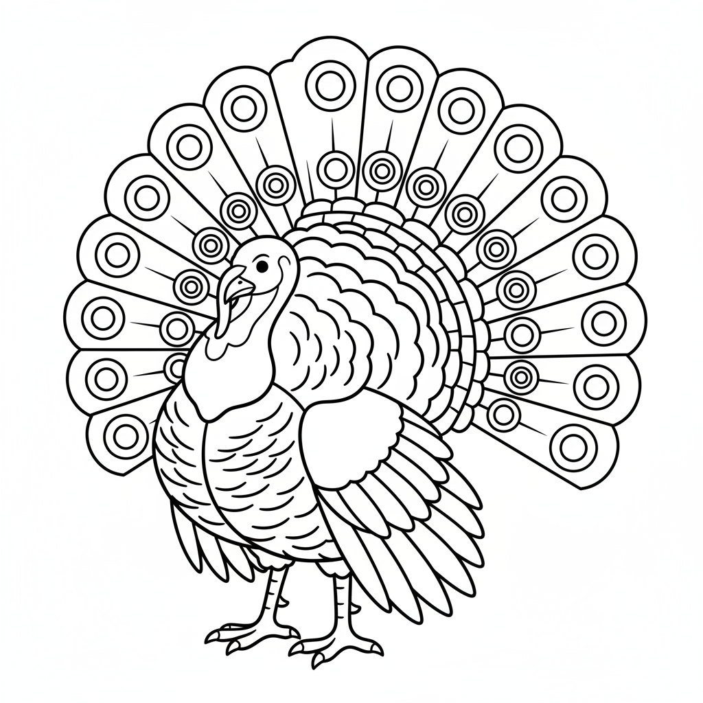 A delightful turkey coloring page featuring male turkey displaying full tail fan with detailed eye-spot feathers. Perfect for kids and adults who love coloring!
