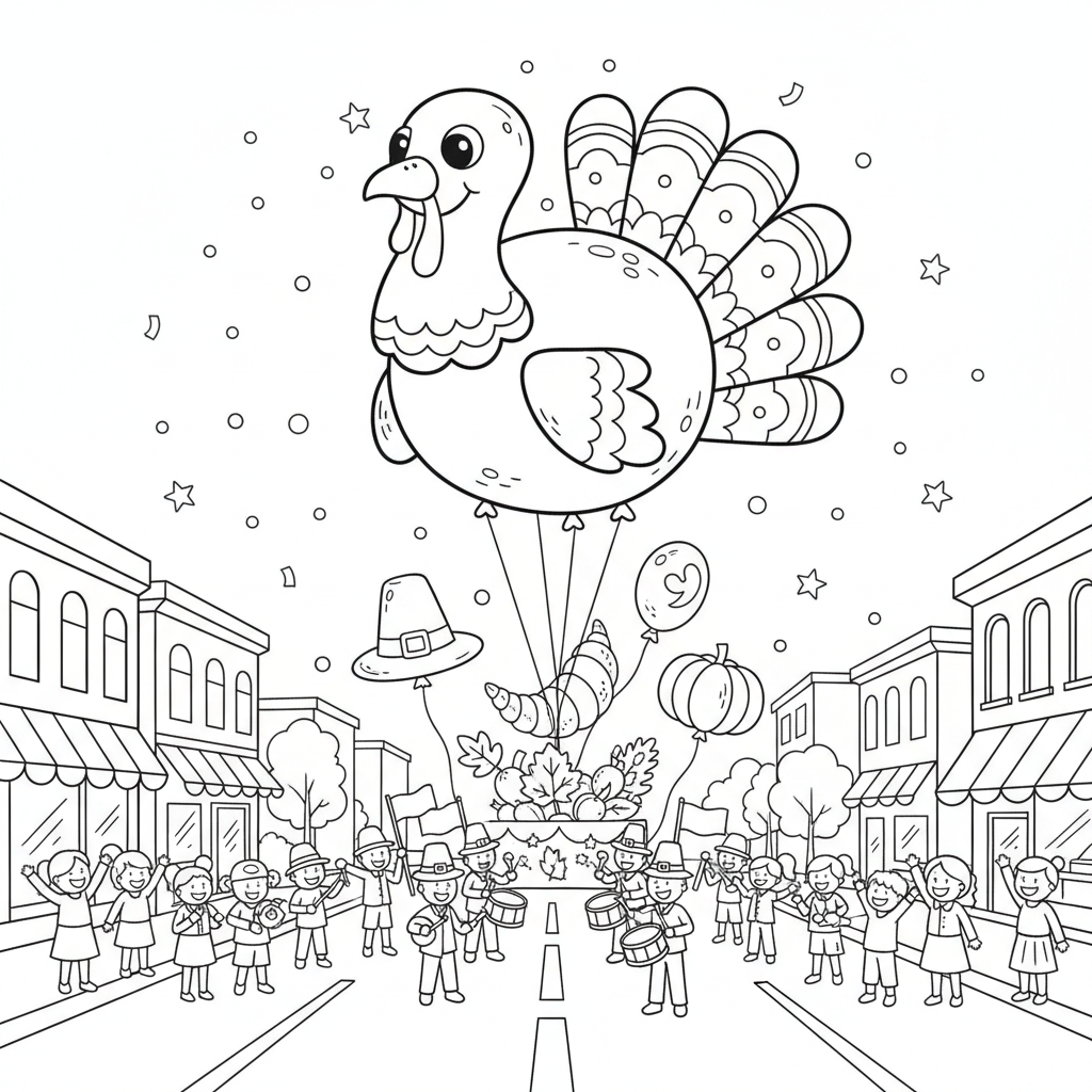 A delightful turkey coloring page featuring Thanksgiving parade scene with a giant turkey balloon floating over the street. Perfect for kids and adults who love coloring!