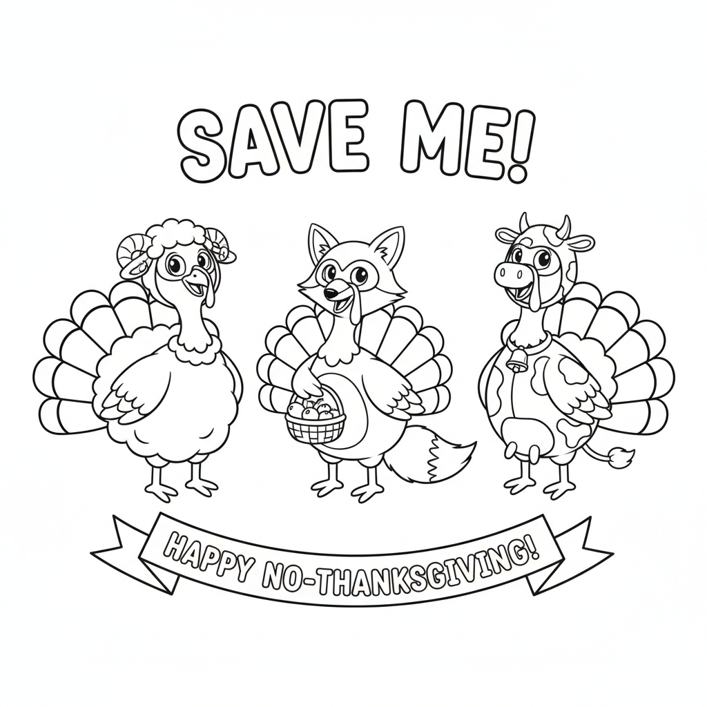 A delightful turkey coloring page featuring turkey disguised as different animals wearing funny costumes to avoid Thanksgiving. Perfect for kids and adults who love coloring!