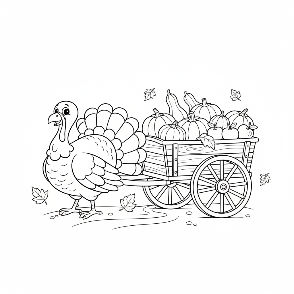A delightful turkey coloring page featuring turkey pulling a wagon full of pumpkins gourds and apples. Perfect for kids and adults who love coloring!