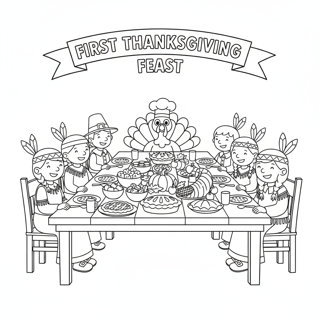 A delightful turkey coloring page featuring turkey sitting at a table with pilgrims and Native Americans at the first Thanksgiving feast. Perfect for kids and adults who love coloring!