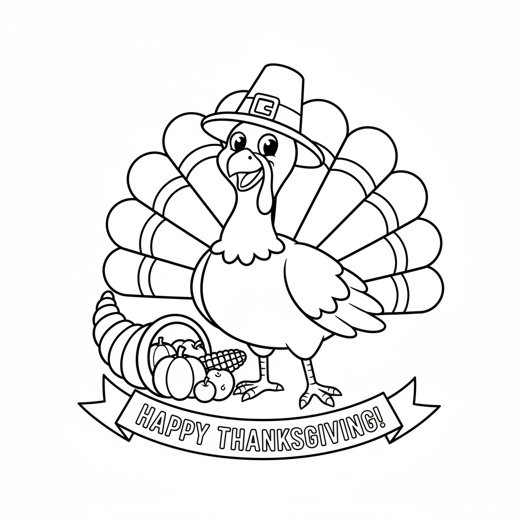 A delightful turkey coloring page featuring turkey wearing a pilgrim hat for Thanksgiving celebration. Perfect for kids and adults who love coloring!