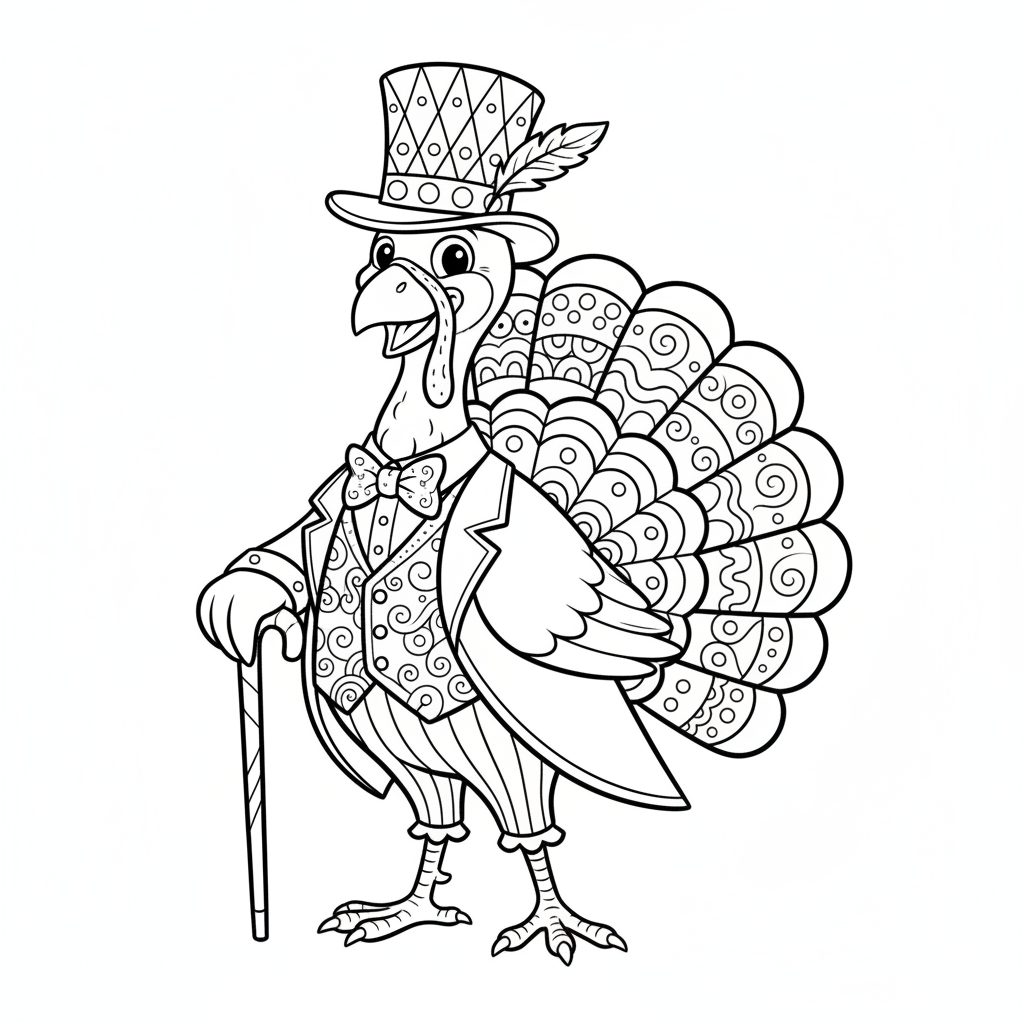 A delightful turkey coloring page featuring turkey with a bow tie and top hat dressed fancy. Perfect for kids and adults who love coloring!
