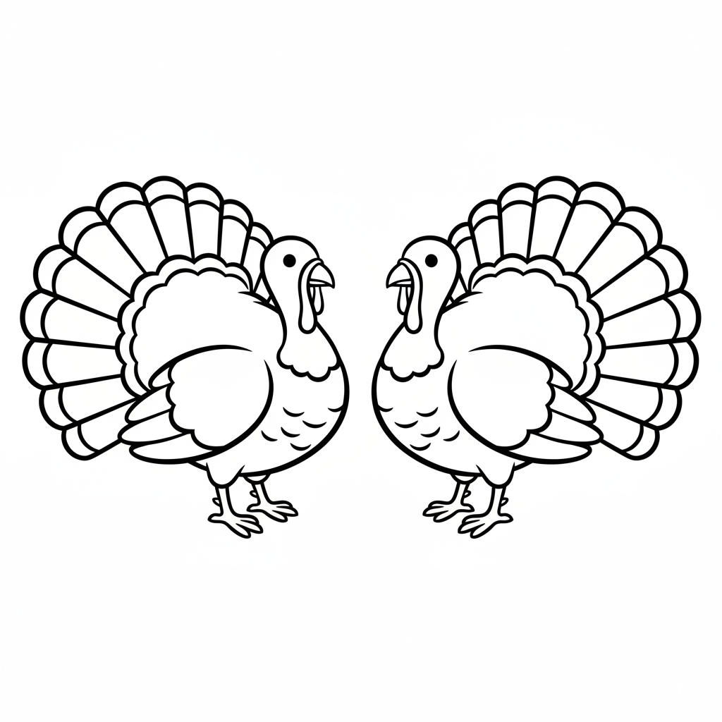 A delightful turkey coloring page featuring two turkeys facing each other with tail feathers spread wide. Perfect for kids and adults who love coloring!