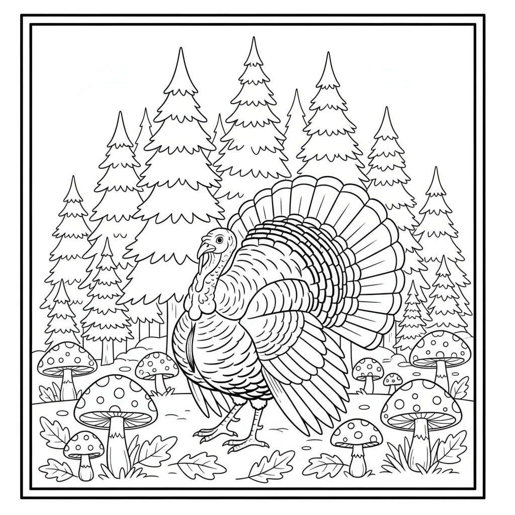 A delightful turkey coloring page featuring wild turkey strutting through a forest with pine trees and mushrooms. Perfect for kids and adults who love coloring!