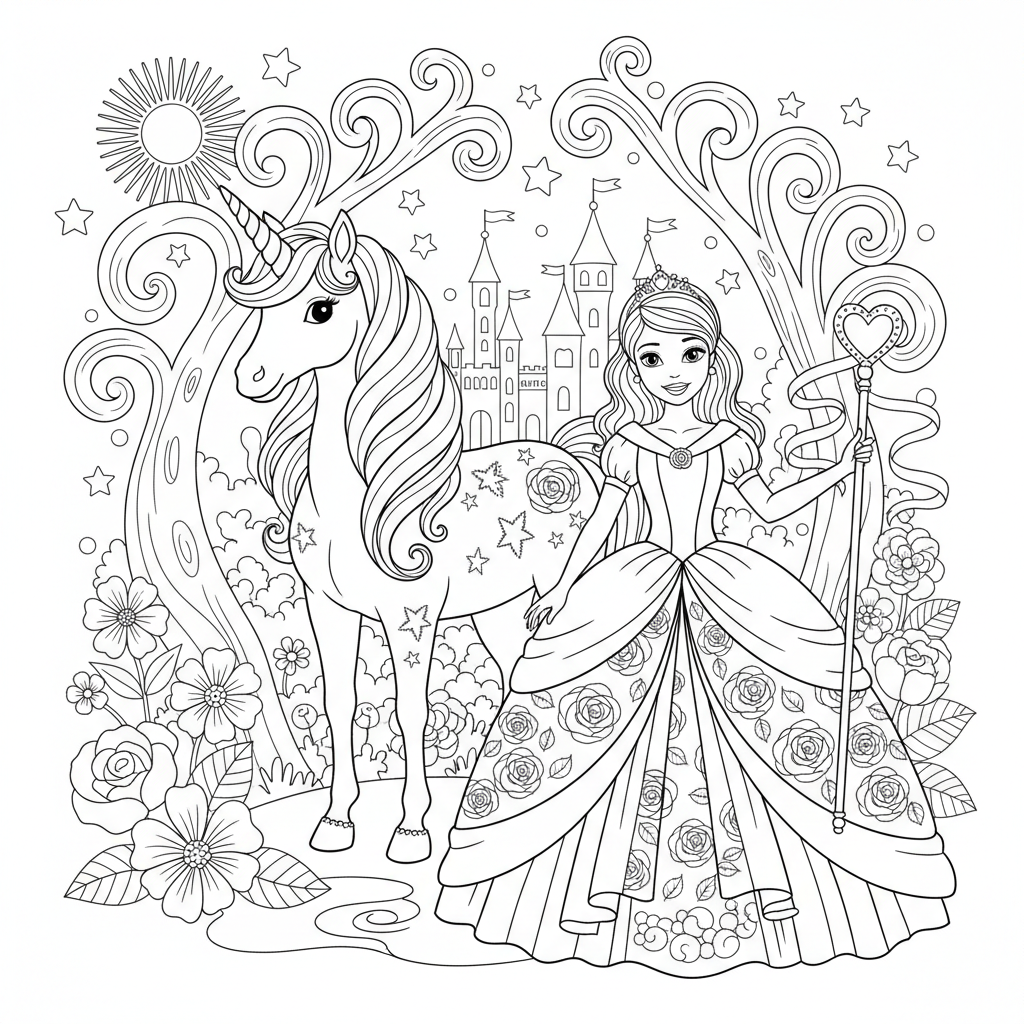 Beautiful unicorn and princess coloring page for kids and adults. Free to download and print.