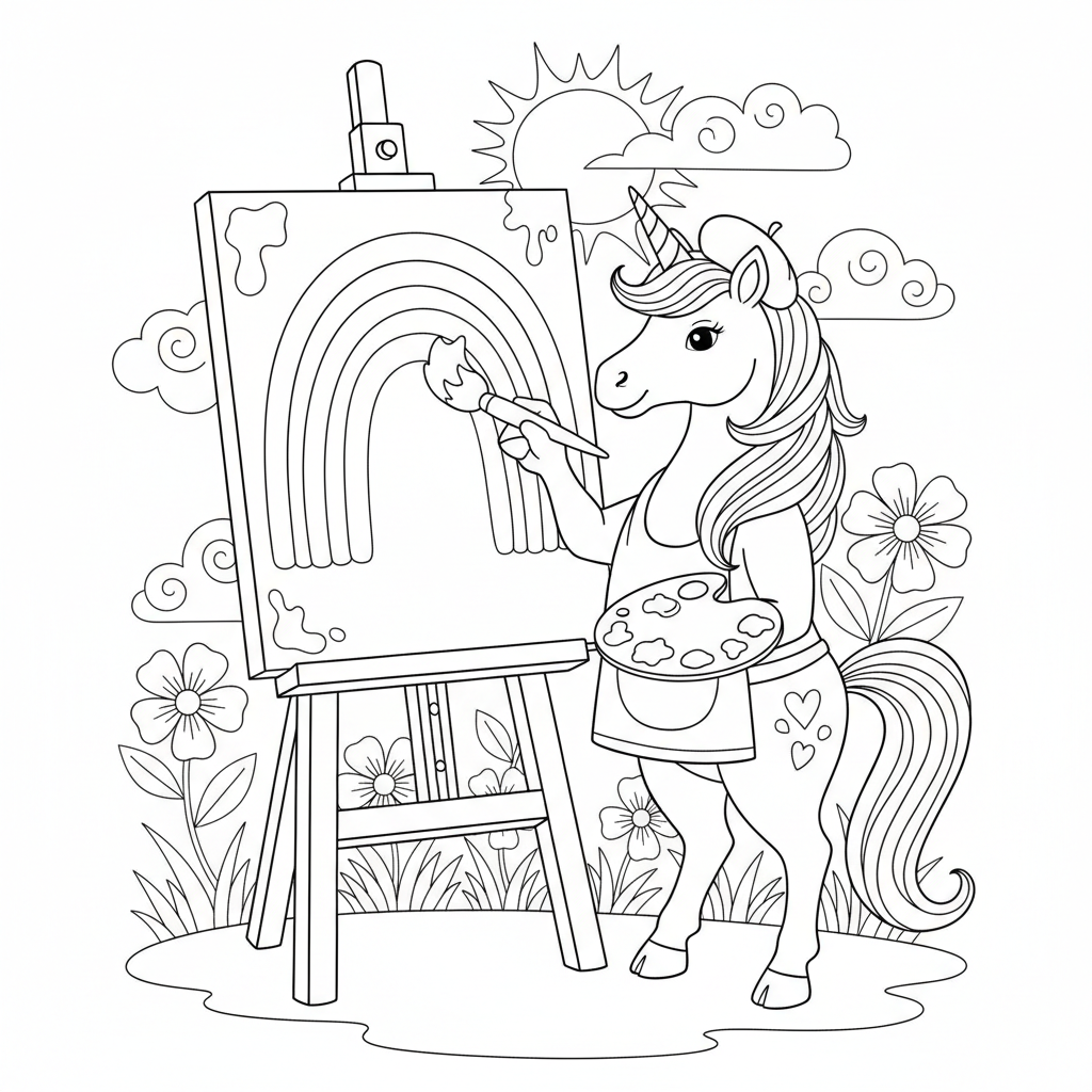 Beautiful unicorn artist painting rainbow coloring page for kids and adults. Free to download and print.