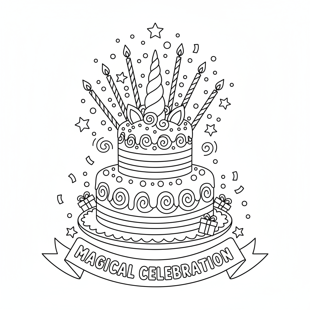 A delightful unicorn coloring page featuring unicorn birthday cake horn candles magical celebration. Perfect for kids and adults who love coloring!