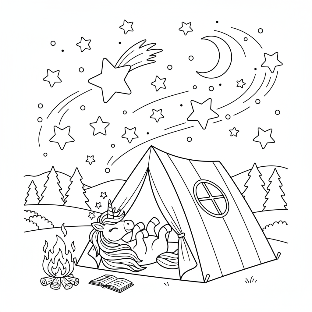 A delightful unicorn coloring page featuring unicorn camping adventure tent stargazing magical night. Perfect for kids and adults who love coloring!