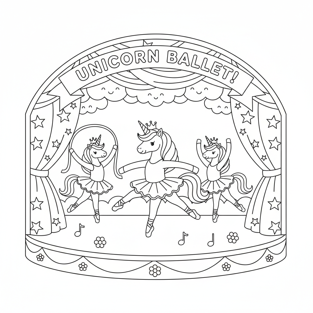 A delightful unicorn coloring page featuring unicorn dance recital ballet graceful performance stage. Perfect for kids and adults who love coloring!