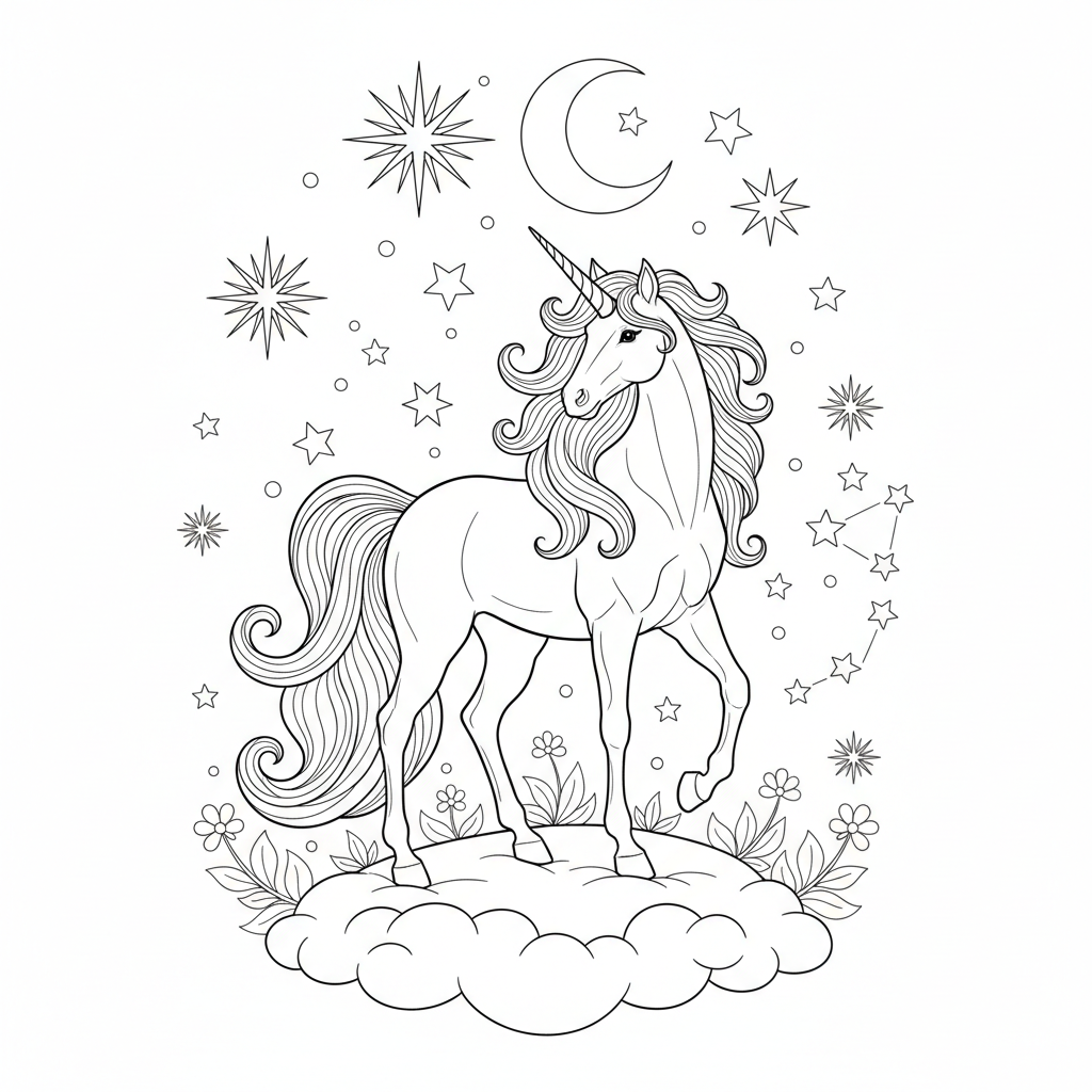 Beautiful unicorn under starry sky coloring page for kids and adults. Free to download and print.